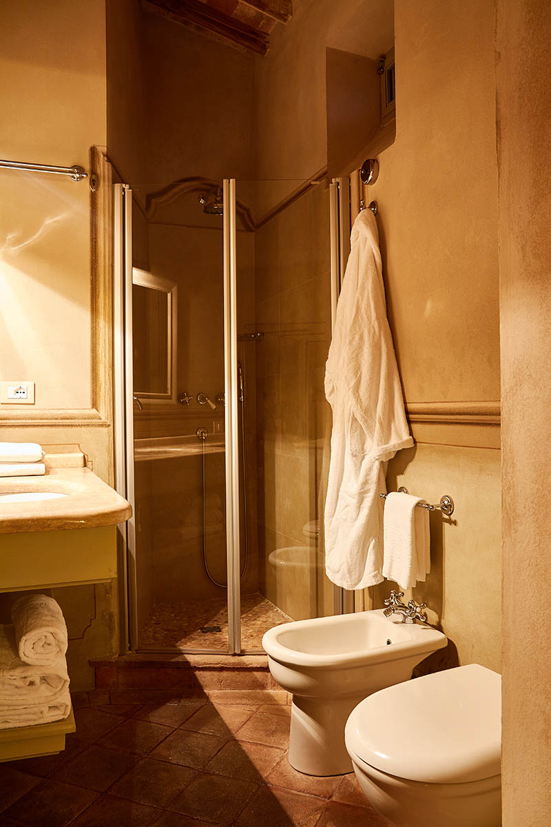 Muri in pietra, interrotti da piccole feritoie che avvolgono la camera in una luce soffusa, antichi letti a baldacchino in ferro battuto, preziosi tendaggi e arredi di famiglia evocano il fascino senza tempo delle dimore di una volta, curate con amore e rispetto per la loro storia.
